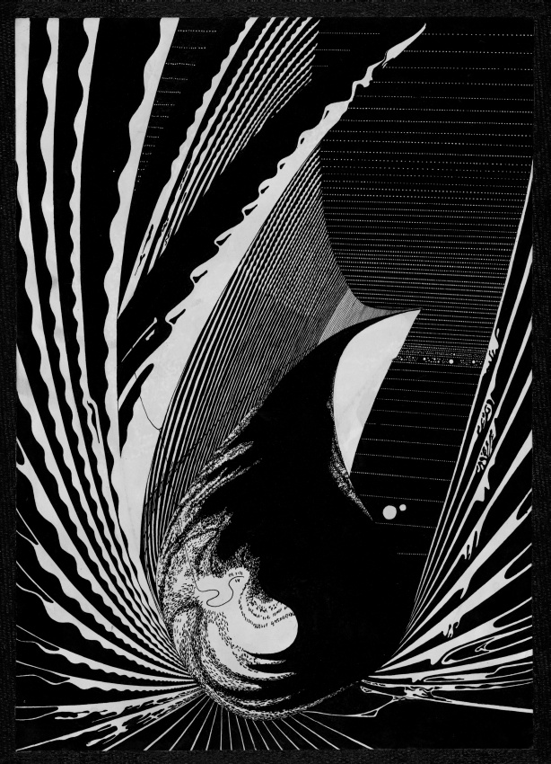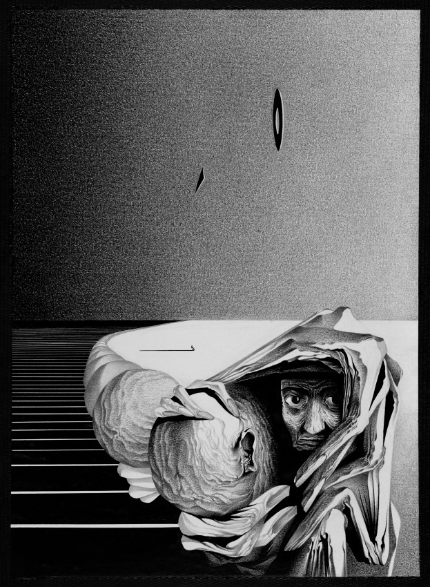 Теория биллиардов изучает поведение идеального шара, движущегося внутри какой-то области и отражающегося от ее границы (т.е. от "стенок") по правилу: "угол падения равен углу отражения". Движение шара зависит от формы области. Особо интересна "предельная картина", когда шар движется "бесконечно долго". В этом случае траектория шара начинает "заметать" данную область, покрывая ее все более усложняющейся сеткой пересекающихся линий. Если фиксировать последовательные положения катящегося шара через равные промежутки времени (скажем, через каждые 0,01 секунды), то область начнет "заполняться шарами". Автор изобразил (в виде черных шаров, пересекающих поле слева направо) последовательные положения катящегося шара. Разные участки области заполняются шарами, вообще говоря, неравномерно. На переднем плане видно, что кое-где шары распределены плотно, а в некоторых областях их мало.МИФОЛОГИЯ.