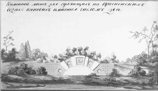 Рисунок взят из книги "История Москвы в документах XII-XVIII веков", где он помещен по названием "Мостики для гуляющих на пресненских прудах. Рисунки XVIII в." Взято из [330:1], с.210.