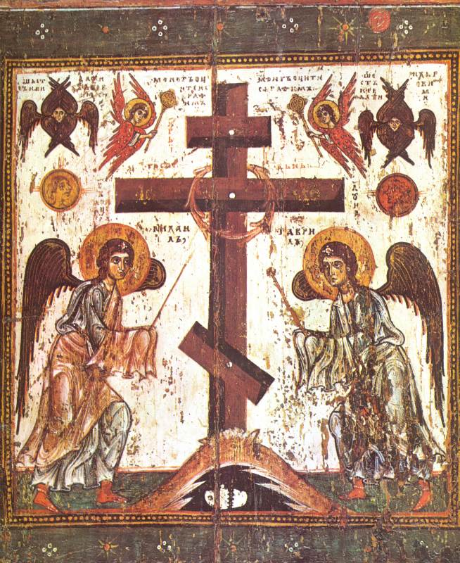 Приведем весьма любопытное изображение распятия Христа, см. рис.2.60. Оно находится на обороте знаменитой новгородской иконы "Спас Нерукотворный", приведенной нами на рис.1.24. Показан крест, на котором был распят Христос. Рядом с крестом надпись: "Крест Господень". С двух сторон к кресту подходят два ангела с крыльями. У одного в руке - копье, а у другого - губка. Причем держат они их так, как будто один собирается проткнуть бок Иисуса, висящего на кресте. А другой собирается поднести ко рту Христа губку. Подобные старинные изображения весьма распространены, см., например, рис.2.60a, рис.2.61, рис.2.62, рис.2.63 и рис.2.63a. НО КОПЬЕ И ГУБКУ ДЕРЖАТ ВСЕГДА ВОИНЫ, РАСПИНАЮЩИЕ ХРИСТА, А ВОВСЕ НЕ АНГЕЛЫ. То есть копье и губка всегда находятся в руках врагов Иисуса. Это - орудия казни. А на новгородской иконе они - в руках ангелов! Причем ангелы занимают здесь места двух римских воинов около креста Иисуса, см. рис.2.60.