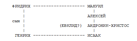 Давайте разберемся - какой Евклид здесь имеется в виду. Речь идет о переговорах между Генрихом и императором Исааком Ангелом. Генрих вспоминает старые обиды, нанесенные его отцу Фридриху, правившему за несколько лет до того, императором Мануилом Комнином. Никита Хониат возмущенно говорит, что Генрих-де вспоминает ДОЕВКЛИДОВСКИЕ времена. Отсюда прямо следует, что правление Мануила и дни Исаака Ангела могло быть названо ДОЕВКЛИДОВСКИМ временем. А следовательно ЕВКЛИДОВСКОЕ время попадает МЕЖДУ правлениями Мануила и Исаака. Но между Мануилом и Исааком было лишь кратковременное правление отрока Алексея и правление Андроника-Христа. Таким образом, возникает четкое впечатление, что Евклидом здесь назван Андроник-Христос.