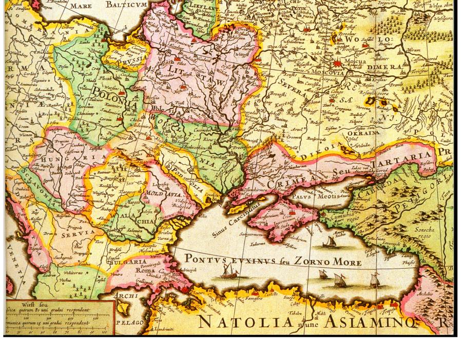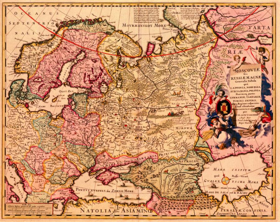 Автор карты, приведенной на рис.1.15, - "Николай Пискатор Старший (голл. Н.Висхер, N.Visscher, часто Н.Фишер), 1618 - ок.1679 гг., представитель династии Пискаторов, голландских картографов кон. XVI - нач. XVIII вв. Карта, изготовленная в мастерской знаменитого ученого и картографа, фиксирует геополитическую ситуацию в Восточной Европе" [618:0], с.69-70. На рис.1.16 и рис.1.17 показаны два ее фрагмента. На рис.1.18 представлен увеличенный фрагмент части Центральной России.