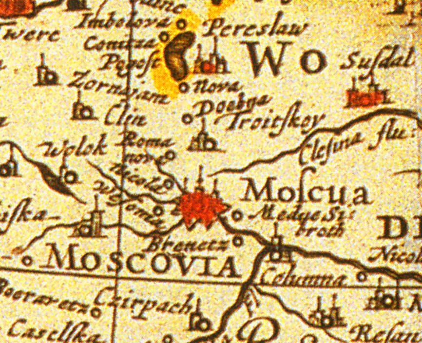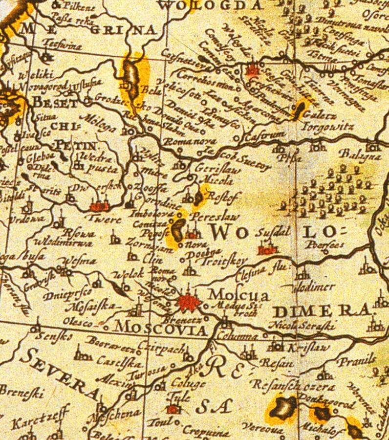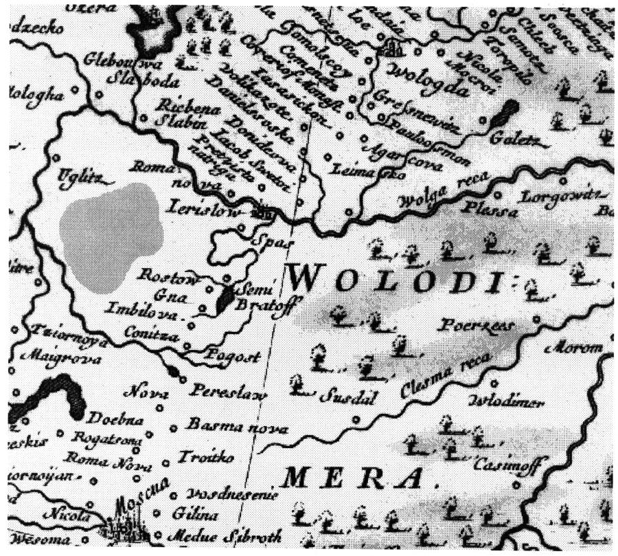 Отметим, что область вокруг Владимира названа WOLODI MERA. Не исключено, что такая запись, в виде двух слов, отразила воспоминания о том, что когда-то здесь располагалась столица Великой = "Монгольской" Империи. Потому в древности город и получил название "Владею Миром" (WOLODI MERA), то есть ВЛАДИМИР.