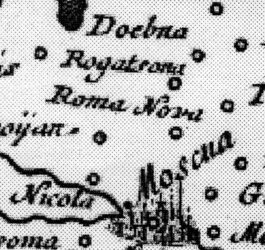 Естественно ожидать, что если "античный" Рим действительно был основан на Руси и долгое время, в XIV-XVI веках, находился в Междуречье Оки и Волги, то, несмотря на "скалигеровскую чистку", должны уцелеть хотя бы некоторые старинные карты, где на территории Руси, сохранились следы названия РИМ. Сейчас мы такие карты предъявим. Обратимся к старинным картам, которые были представлены на выставке "Россия и Швеция в XVII веке", проходившей в Москве, в Государственном Историческом Музее в 2001 году [618:0]. См. также информацию о выставке в майском номере 2001 года журнала "Moscow today & tomorrow", с.16-23. Мы благодарим сотрудника МГУ А.И.Шаталкина, обратившего наше внимание на эти карты и отметившего, что на них присутствует название "Рим Новый" на территории России.