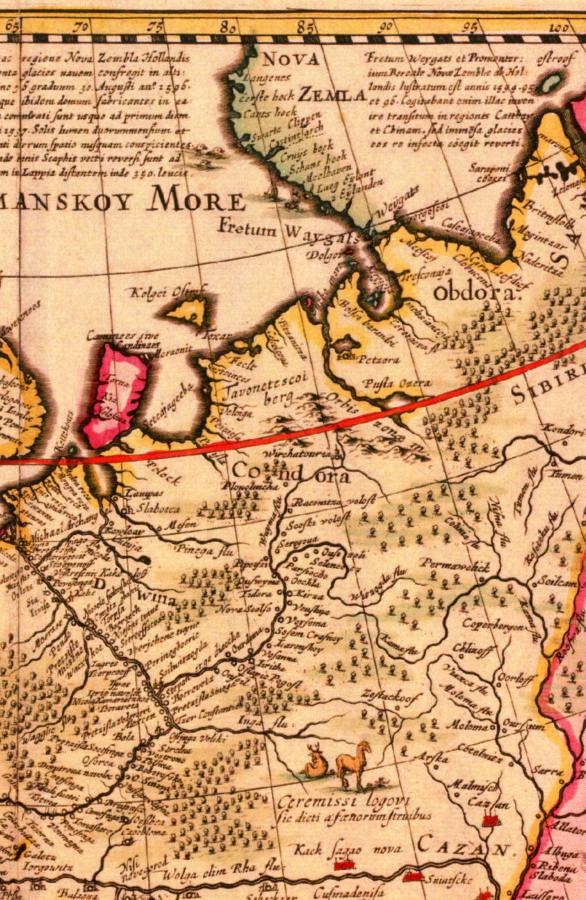 Стоит обратить внимание, что на карте Фредерика де Вита по Северной Двине отмечено очень много городов, рис.1.25. Их даже больше, чем указано около Москвы и южнее. Более того, на карте Пискатора Старшего, на Новой Земле также указано большое число городов, рис.1.26. Так что в ту эпоху эти земли были плотно заселены.