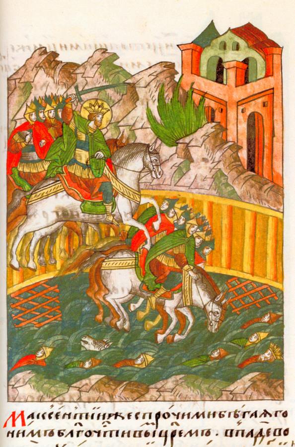 Некоторые "античные" источники сообщают, что Максенций УТОНУЛ В РЕКЕ. В книге [140] эти сведения изложены так. В самом конце битвы "мост (Мильвийский мост через реку Тибр - Авт.) под чрезмерной тяжестью преторианцев в металлических доспехах рухнул. Вместе с ними В ВОДЕ ОКАЗАЛСЯ И МАКСЕНТИЙ... Через два часа... на другой стороне реки он (Константин - Авт.) заметил воина, пытающегося выбраться на берег. Золотые доспехи выдавали в нем самого первого человека в армии противника (то есть Максенция - Авт.)... Он (Константин Великий - Авт.) пришпорил коня и помчался к берегу. Течение реки было довольно сильным, поток не раз захлестывал и седока и лошадь с головой. Но вот наконец копыта коснулись дна, и Константин выбрался неподалеку от того места, где тело Максентия в золотом панцире УЖЕ НАЧАЛО ТОНУТЬ. Враг был мертв" [140], с.93.