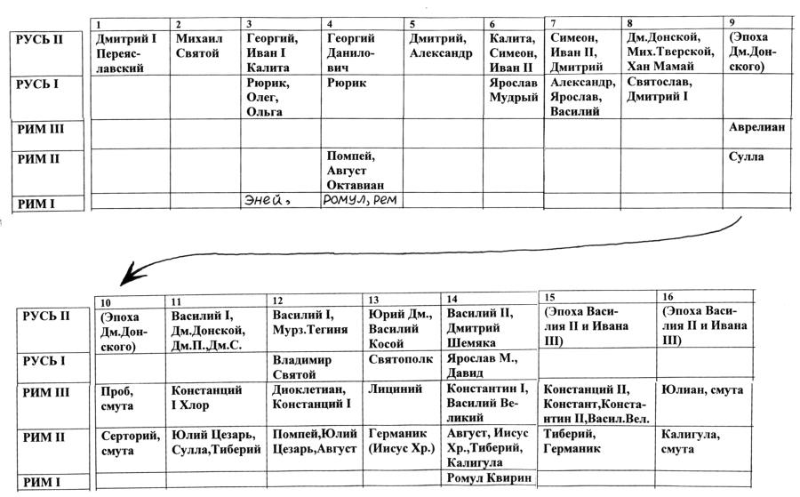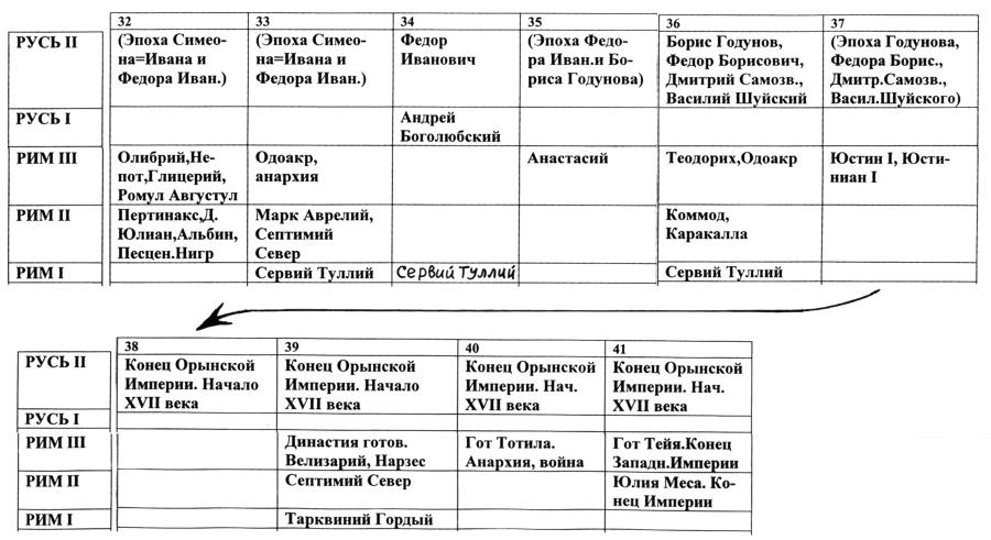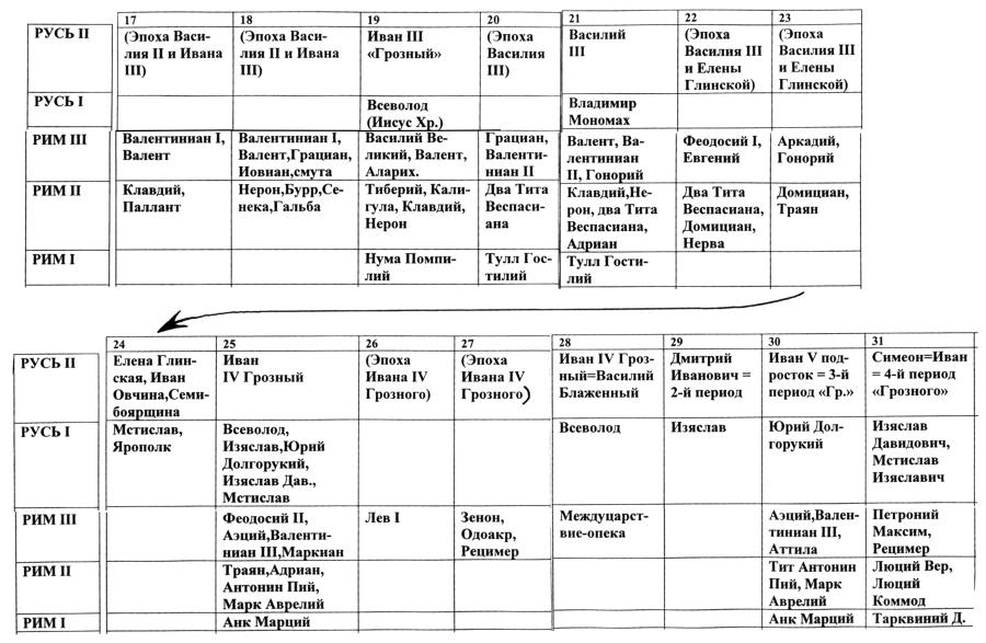 Поясним, что на приведенных здесь рисунках в самой верхней строке, названной "Русь II", последовательно перечислены все правители Великой = "Монгольской" Империи. Период времени, охваченный Империей, разбит на 41 отрезков, в каждом из которых указаны цари-ханы, правившие в это время. Вторая строка "Русь I" представляет собой фантомное отражение Великой Империи при сдвиге вниз на 300-400 лет. Последующие три строки изображают, соответственно, Третью Римскую Империю (Рим III), Вторую Римскую Империю (Рим II) и Царский Рим (Рим I). Поскольку при наложениях летописцы иногда путались в описаниях царей, правивших примерно в одну и ту же эпоху, то кое-где соответствие размыто.