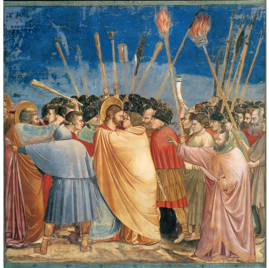 Рис.1.71. Арест Христа и предательство Иуды. Фреска Джотто. Якобы 1303-1395 годы. Падуя, капелла дель Арена. Слева показан апостол Петр, наносящий удар мечом (ножом) одному из нападающих и отрубающий ему ухо. Взято из [654:0], илл.115.