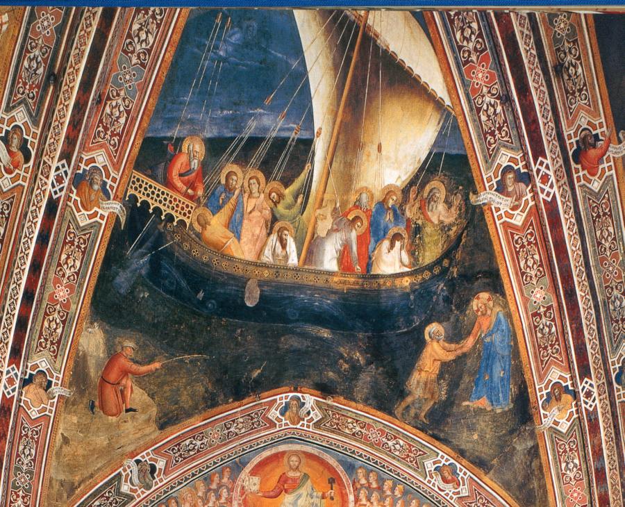 г) Христос, идущий по воде вместе с апостолом Петром, и переправляющийся затем на лодке (корабле) через море.