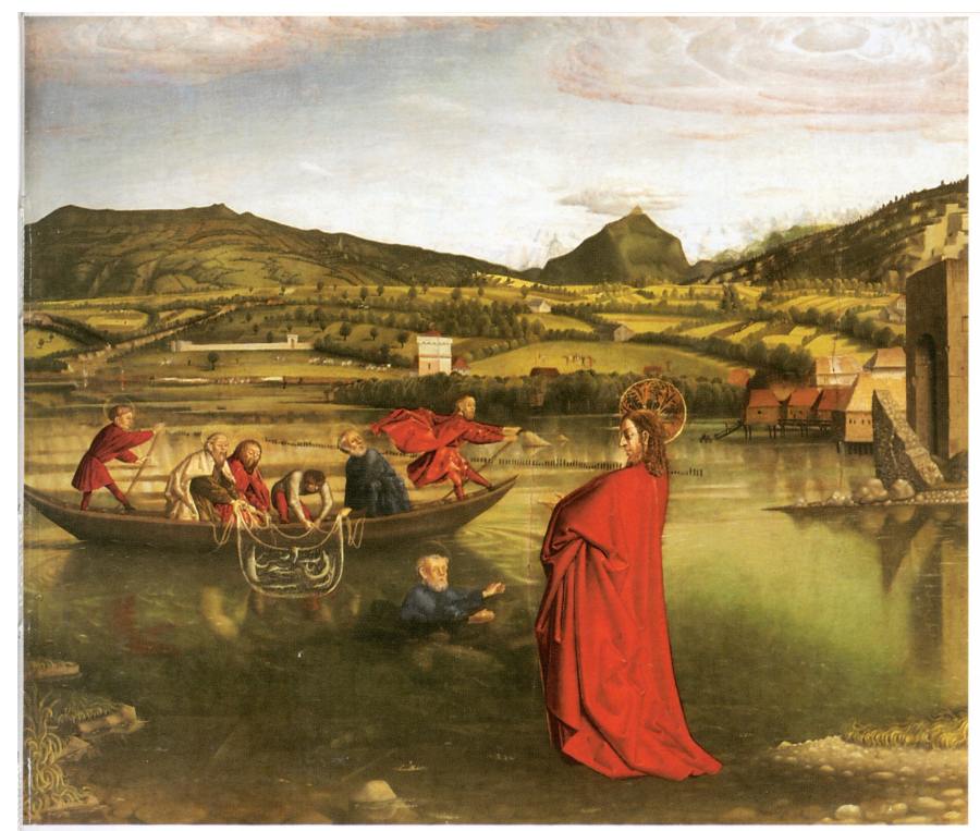 Евангелия излагают в общем ту же историю "хождения Иисуса по воде" в чуть ином освещении. "Понудил Иисус учеников Своих войти в лодку и отправиться прежде Его над другую сторону (моря - Авт.)... В четвертую же стражу ночи ПОШЕЛ К НИМ ИИСУС, ИДЯ ПО МОРЮ. И ученики, увидев Его ИДУЩЕГО ПО МОРЮ, встревожились... и от страха вскричали" (Матфей 14:22, 14:25-26). Апостол Петр вышел из лодки и некоторое время шел по воде, однако вскоре стал тонуть. Христос поддержал его, и они оба вошли в лодку, после чего все вместе переправились через море, рис.1.73. На рис.1.74 этот сюжет - хождение Иисуса по воде и плывущий Петр - совмещен со сценой чудесного лова рыбы (Иоанн 21:3-11).