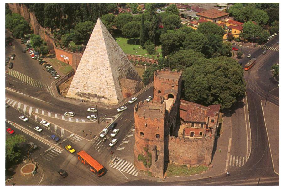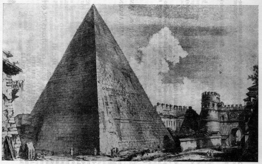 Из наших результатов вытекает, что события, связанные с Андроником-Христом, то есть с Ромулом-Ремом, происходили вовсе не в итальянском Риме, а в Царь-Граде и на Руси. Но потом, когда скалигеровская история перенесла - на бумаге - историю Ромула и Рема в итальянский Рим, возникший в Италии не ранее конца XIV века, началась бурная "деятельность" по изготовлению вещественных памятников "славного прошлого". К таким искусственным памятникам относится, по-видимому, так называемый "Столп Рема", показанный на старинной гравюре, рис.1.75 и рис.1.76. В слегка изменившемся виде он сохранился до нашего времени, рис.1.77. Скорее всего, подлинное предназначение этой средневековой итальянской пирамиды было либо забыто, либо специально отправлено в небытие, чтобы фальшиво связать ее с историей Рема. Впрочем, сегодня историки предпочитают называть данную пирамиду не "могилой Рема" - как будто бы утверждал Петрарка-Плутарх, - а "могилой Кайо Честио Эпулона" или могилой Цестия [138], с.41. На рис.1.77a приведено еще одно старинное ихображение пирамиды Цестия.