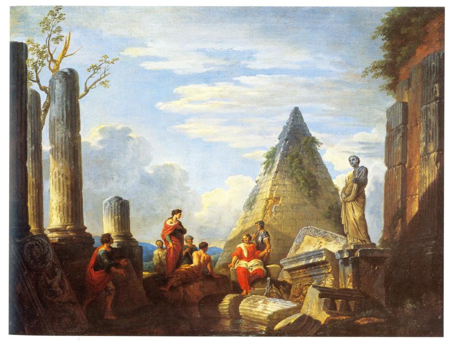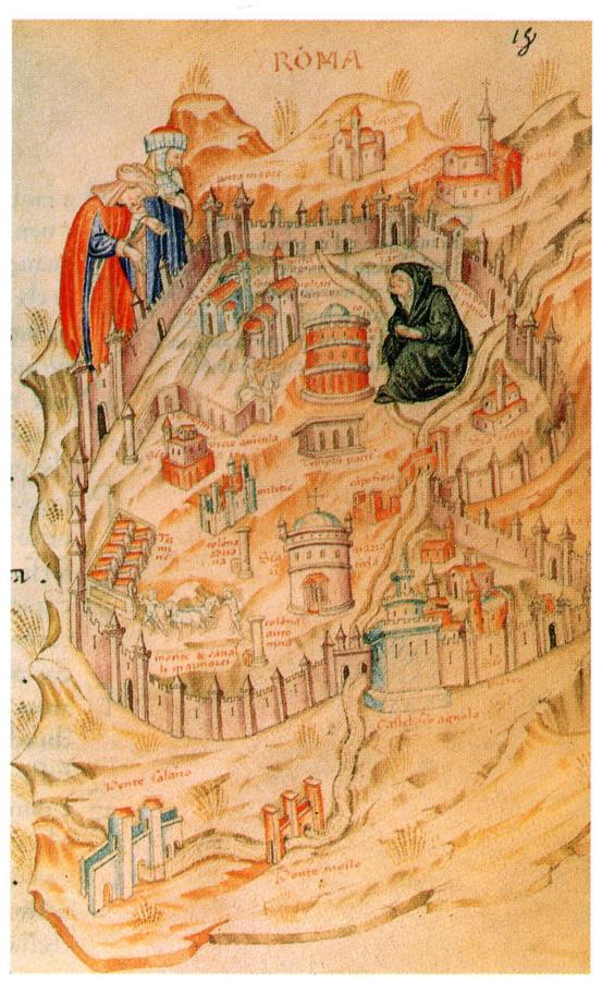 Между прочим, на старинном плане итальянского средневекового Рима XIV или XV века, приведенном на рис.1.78, пирамида Рема или Цестия (Честио) вообще не показана! В то же время видны несколько христианских храмов с крестами на крышах. Поэтому возникает резонный вопрос: так когда же была построена "античная" пирамида, не то Рема, не то Цестия? Может быть, в эпоху XVI века, уже после того, как был нарисован план Рима XIV-XV веков, представленный на рис.1.78? На картине XVIII века, показанной на рис.1.79, пирамида Цестия (Кая Кастия) уже присутствует.