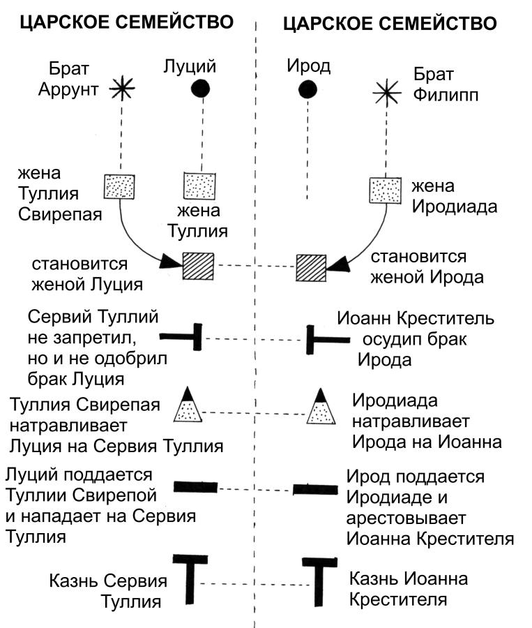 В обеих версиях мы видим одинаковую ситуацию: осуждение Иоанном Крестителем = Сервием Туллием брака царя, или царского сына, на жене брата.