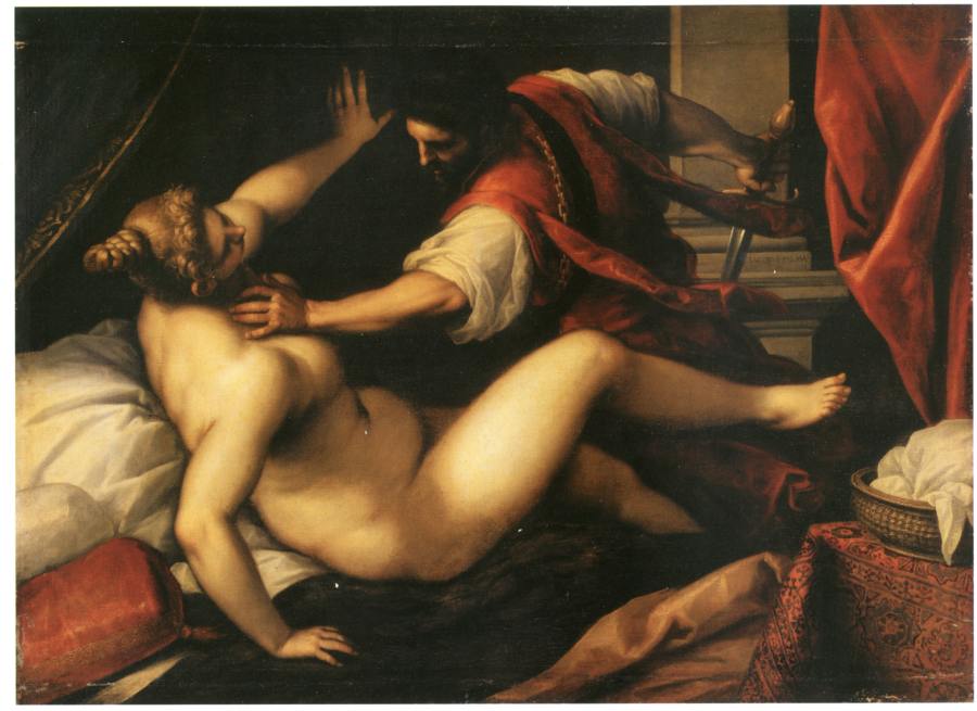 Несколько дней спустя, втайне от Коллатина, Секст Тарквиний с единственным спутником прибыл в Коллацию. Он был радушно принят не подозревавшими о его замыслах хозяевами; после обеда его проводили в спальню для гостей, но, едва показалось ему, что вокруг достаточно тихо и все спят, он, распаленный страстью, входит с обнаженным мечом к спящей Лукреции и, придавив ее грудь левой рукой, говорит: "Молчи, Лукреция...". В трепете... женщина видит: помощи нет, рядом - грозящая смерть; а Тарквиний начинает объясняться в любви, уговаривать... Видя, что Лукреция непреклонна... он... пригрозил ей позором: к ней-де, мертвой, в постель он подбросит, прирезав, нагого раба - пусть говорят, что она убита в ГРЯЗНОМ ПРЕЛЮБОДЕЯНИИ. Этой ужасной угрозой он одолел ее НЕПРЕКЛОННОЕ ЦЕЛОМУДРИЕ (рис.2.78 - Авт.). Похоть как будто бы одержала верх, и Тарквиний вышел, упоенный победой...
