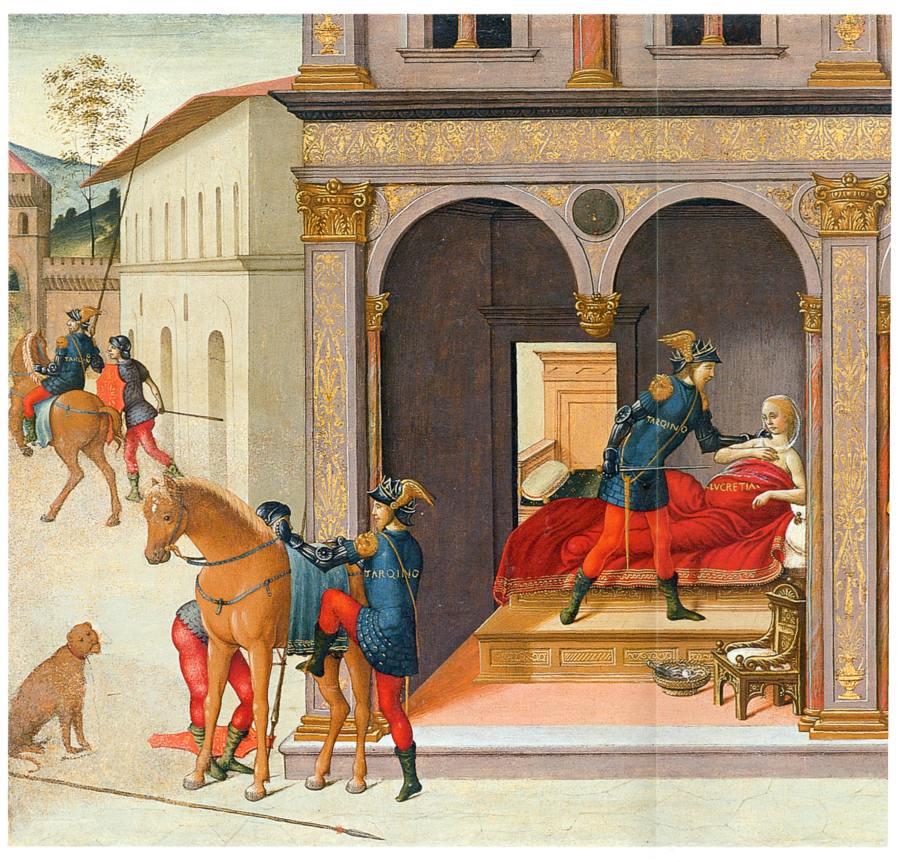 # Тит Ливий сообщает, что Секст Тарквиний, охваченный страстью, желает обесчестить Лукрецию. Он коварно, под маской друга, приходит в дом Лукреции, ночью тайком проникает в ее спальню и насилует ее.