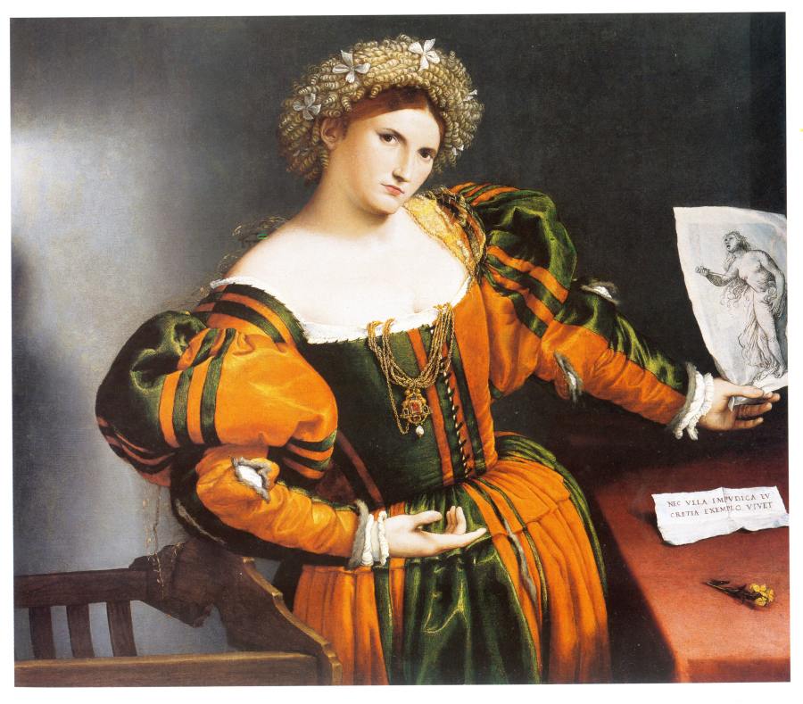 История Лукреции была весьма популярна среди художников XV-XVIII веков. На рис.2.79, рис.2.80, рис.2.81, рис.2.82, рис.2.83 показаны картины на эту тему, созданные якобы в конце XV века. На рис.2.84 приведена картина Лоренцо Лотто "Портрет Лукреции", якобы 1533 года. Считается, что тут изображена современница художника. При этом Лукреция держит в руке рисунок с "античной" Лукрецией (наносящей себе смертельный удар), указывая на нее правой рукой. Видно, что история "античной" Лукреции была достаточно известна в XVI веке; этот образ был всеми узнаваем.
