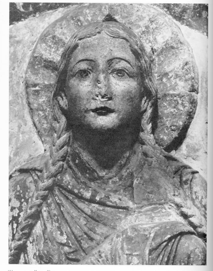 От себя добавим, что цитированное выше старинное описание Девы Марии можно вполне отнести к славянке. ВЫСОКАЯ ЖЕНЩИНА С КРУГЛЫМ ЛИЦОМ И СВЕТЛЫМИ ВОЛОСАМИ. Кстати, такая внешность Богородицы хорошо согласуется с независимыми нашими выводами, что Дева Мария была родом из Руси-Орды, см. книгу "Царь Славян". В книге "Методы", гл.2, мы уже приводили старинное изображение Девы Марии с двумя длинными косами. Уместно еще раз воспроизвести его здесь, рис.2.86. Здесь обращает на себя внимание славянский тип лица Девы Марии. Кстати, оказывается, подобные изображения Мадонны с косами были распространены в древности. Комментаторы сообщают: "Как и хильдесхаймская, хальберштадская Мадонна принадлежит к ИЗВЕСТНОМУ РОМАНСКОМУ ИКОНОГРАФИЧЕСКОМУ ТИПУ МАДОНН С КОСАМИ" [992], с.23.