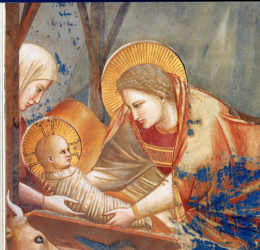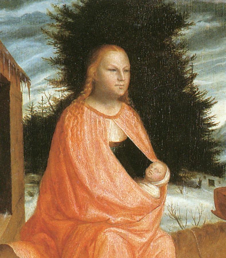 На рис.2.87 мы приводим фрагмент старинной картины "Бегство в Египет", уже обсуждавшейся нами, но по другому поводу, в главе 1. Дева Мария изображена здесь светловолосой, с длинными косами. Тип лица - европейский, славянский. Деву Марию с косами рисовали и итальянские художники. На рис.2.88 приведен фрагмент известной картины "Рождество Христа" Джотто. Светлые волосы Девы Марии, цвета пшеницы, заплетены в косы и уложены венцом вокруг головы. Тип лица - славянский.