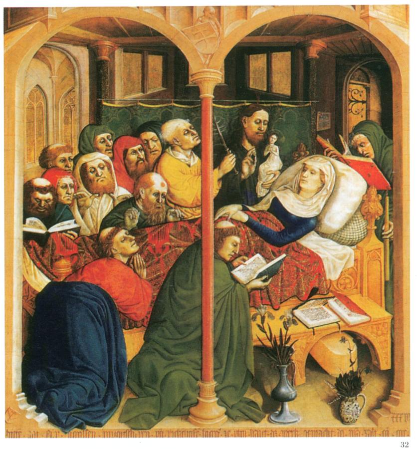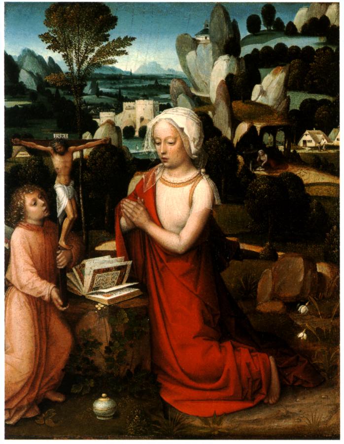 Итак, одна средневековая традиция стала говорить, что тут показано Успение Марии и что мужчина над ней - это Христос, держащий в руках маленькую фигурку, символизирующую душу Марии. Другая традиция считала, что тут показано Рождение Младенца Христа кесаревым сечением. Мария Богородица лежит на постели, а врач извлекает Младенца из ее живота. Фреска Джованни да Милано выдержана в духе именно этой, второй традиции. На рис.2.113a приведено еще одно интересное изображение Марии Магдалины.