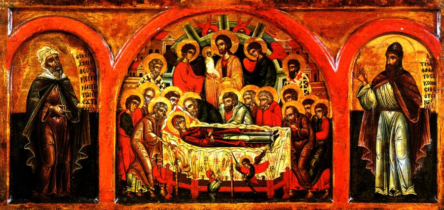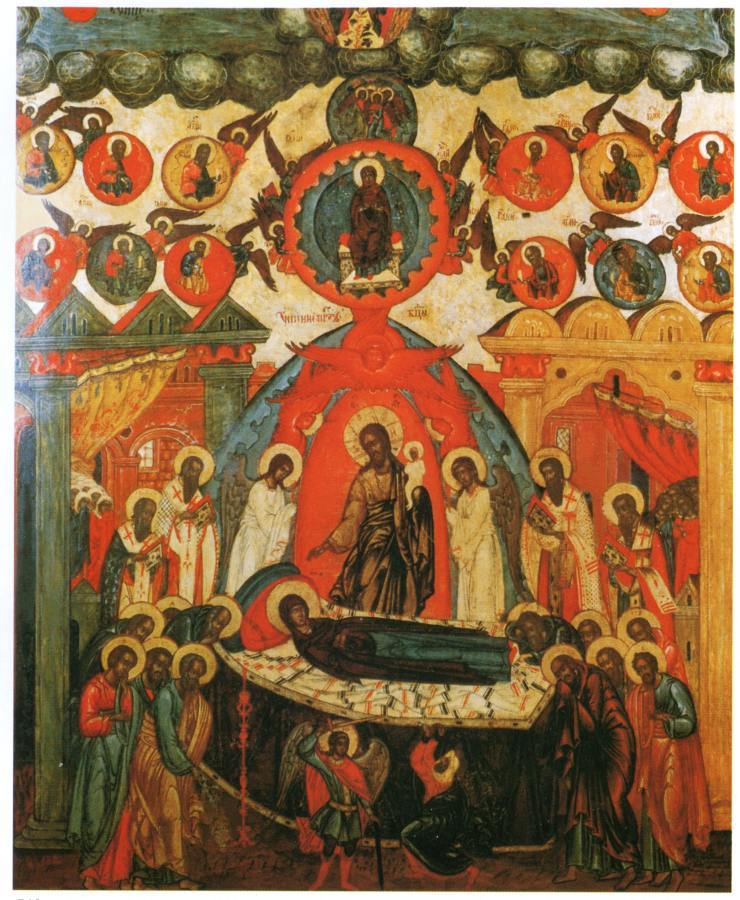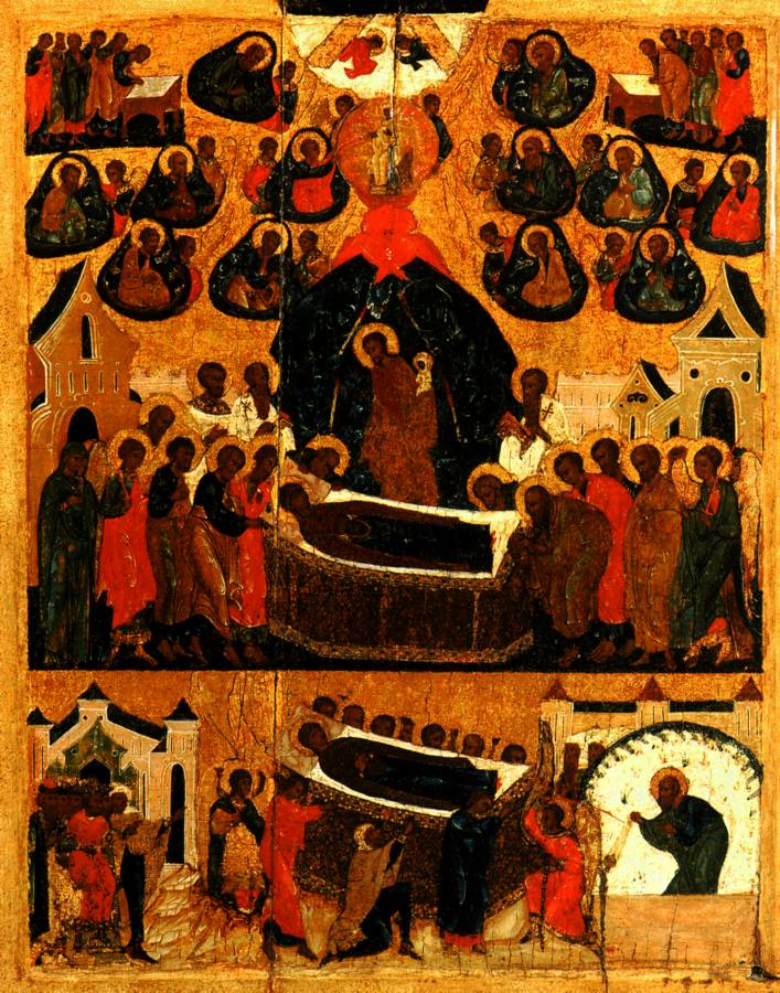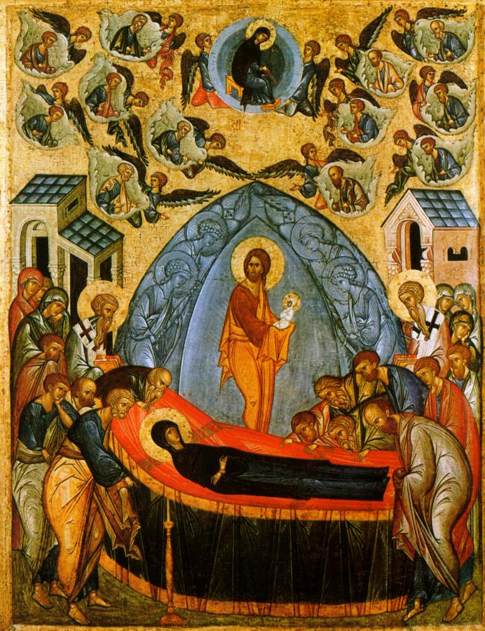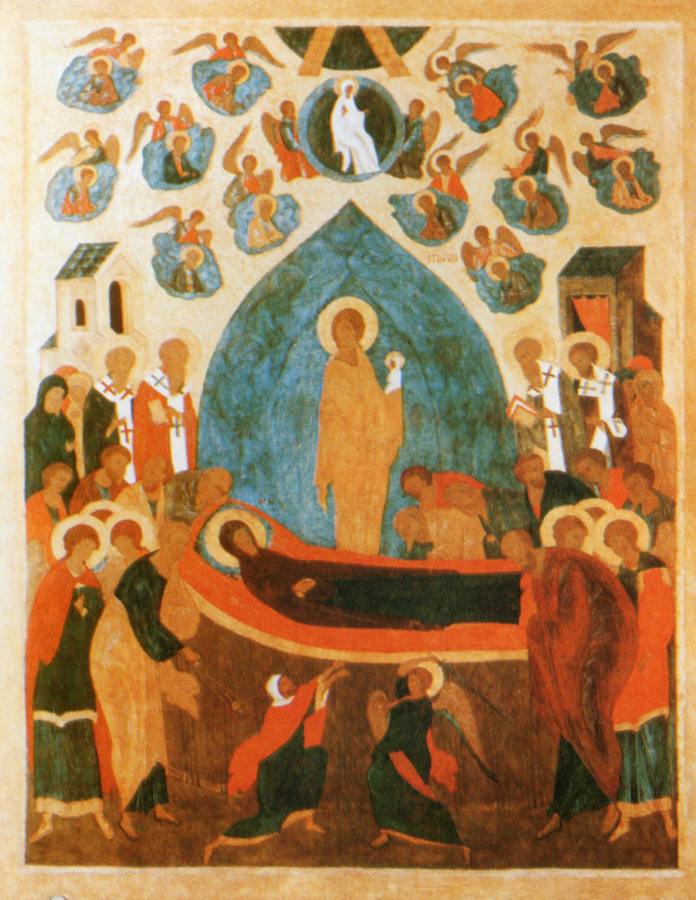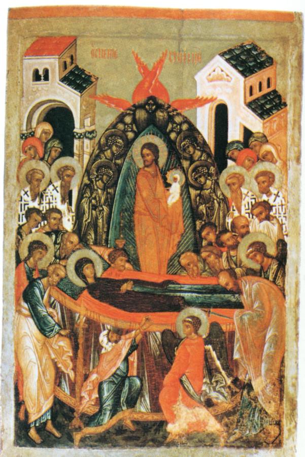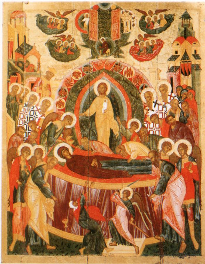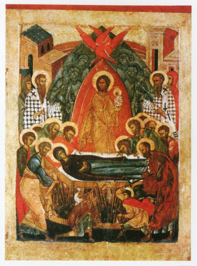 Говорится следующее. <<Апостолы, сподобившиеся видеть славное восхождение на небо Пресвятой Богородицы, в трепете стояли, смотря на небо... Смотрели на пречистое Ее тело (лежавшее на одре - Авт.)...