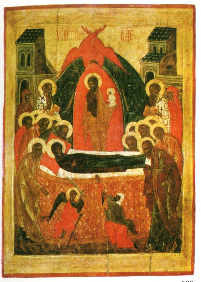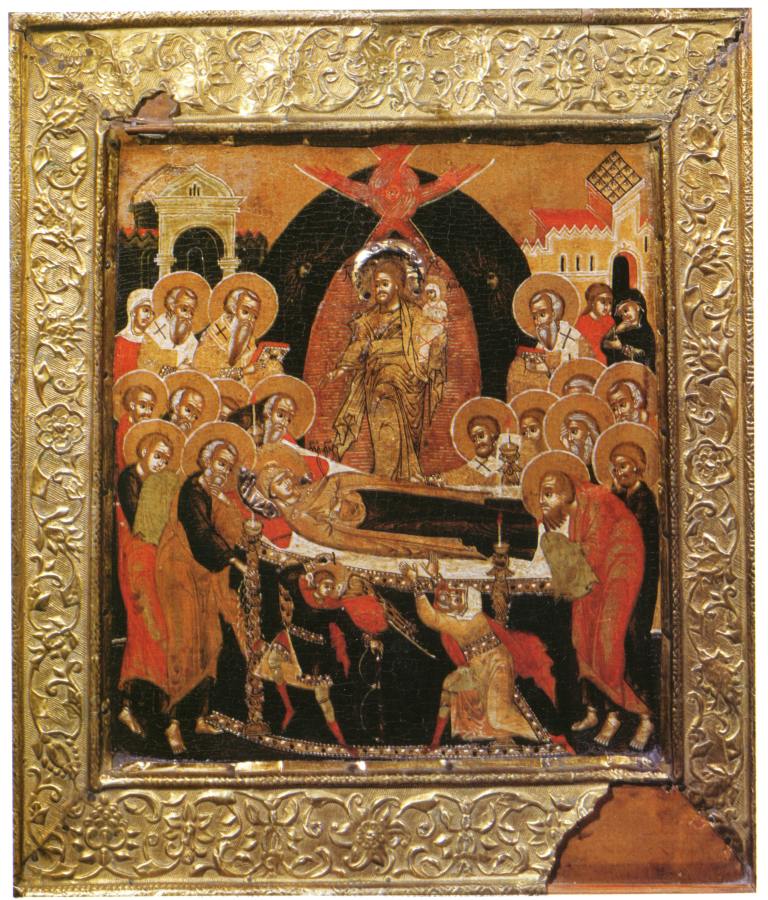 # Афоний обращается к Христу и молит об исцелении. Напомним, что на православных иконах "Успения Богоматери" рядом с Марией практически всегда изображается Христос с маленькой запеленутой фигуркой на руках.