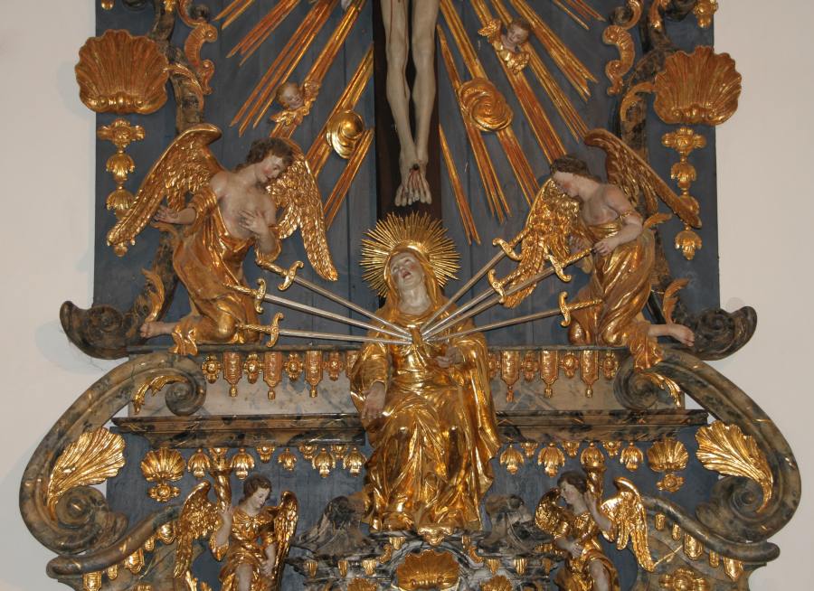 Также становятся более ясными и христианские изображения вроде приведенного на рис.2.105. Это - известная икона Богоматери под названием "Семистрельная". Аналогично выглядит и икона "Умягчение злых сердец". Комментаторы пишут так: <<Пророчество святого Симеона Богоприимца о той скорби, которая ждала Божию Матерь у Креста Ее Сына - "Тебе Самой оружие пройдет душу", - символически изображалось на "Семистрельной" иконе. СЕМЬ МЕЧЕЙ, ПРОНЗИВШИХ СЕРДЦЕ ПРЕСВЯТОЙ БОГОРОДИЦЫ... Между иконами "Умягчение злых сердец" (называемой также "Симеоново проречение") и "Семистрельная" есть небольшое различие - мечи расположены на них по-разному: на первой - по три справа и слева, а один - внизу; а на второй - три с одной и четыре с другой стороны... Раньше у этих икон были и разные дни празднования>> [963], с.137-138. На рис.2.105a приведено изображение Девы Марии, пронзенной семью мечами, из старинной церкви Maria Worth, построенной якобы в XII веке, на берегу Вортерзее в Австрии.