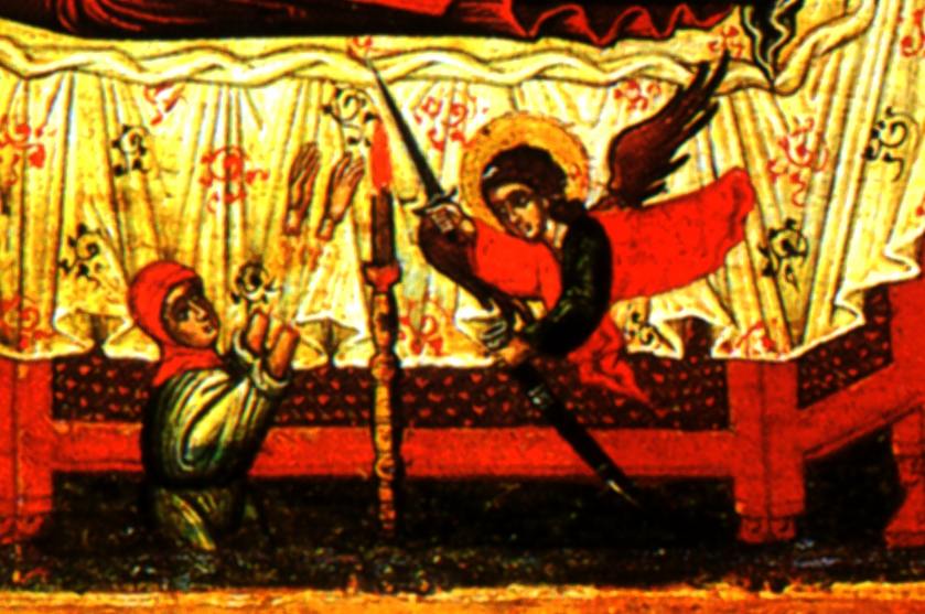 # Рядом с одром Богоматери оказывается некий "злой" человек, желающий прикоснуться к пречистому телу Богоматери.