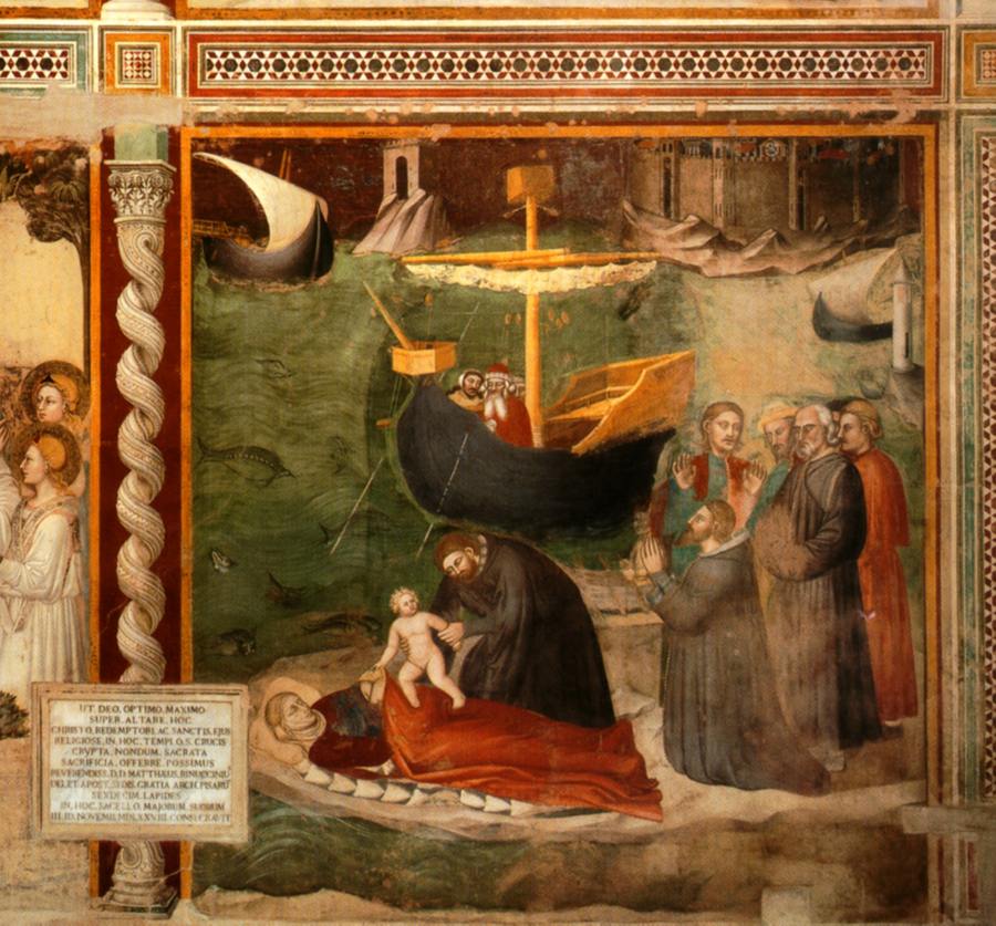 В Новом Завете о таких сюжетах, связанных с Марией Магдалиной, ничего не говорится. Итак, нам предлагают считать, будто художник соединил на фреске два различных события. Может быть и так. Но если принять предлагаемое историками толкование данной фрески, то следовало бы ожидать, что на ней должна быть изображена САМА МАРИЯ МАГДАЛИНА, молитвами которой и была воскрешена жена правителя и спасен некий ребенок. Однако все люди, за исключением лежащей на постели женщины, это - мужчины! Первая мужская группа находится справа. Еще трое мужчин изображены в корабле, стоящем на якорях у берега. Совершенно ясно видно, что НИ ОДНОЙ ЖЕНЩИНЫ СРЕДИ ЛЮДЕЙ, ОКРУЖАЮЩИХ ЛЕЖАЩУЮ ПРАВИТЕЛЬНИЦУ, ЗДЕСЬ НЕТ. Но тогда возникает естественная мысль, что Мария Магдалина на фреске все-таки изображена. А именно, как лежащая женщина-правительница. Все становится на свои места.