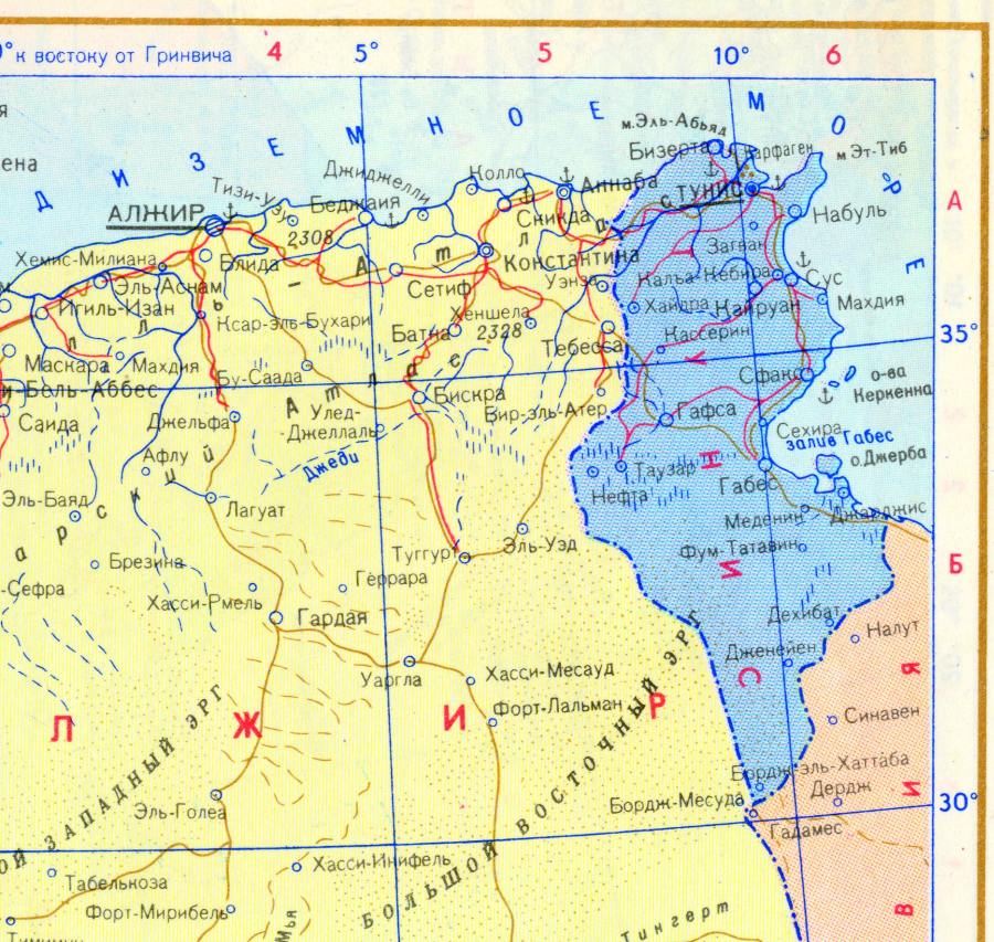 По-видимому, до нас дошли старинные карты, на которых скалигеровские историки впервые разместили летописный Карфаген на севере Африки, рис.3.2. Это - карты "античного" Птолемея. В наших книгах "Библейская Русь" и "Старые карты Великой Русской Империи" мы показали, что на самом деле "античные" карты Птолемея были созданы в эпоху XVI-XVII веков или даже позже. На рис.3.3 приведена современная карта этих мест.