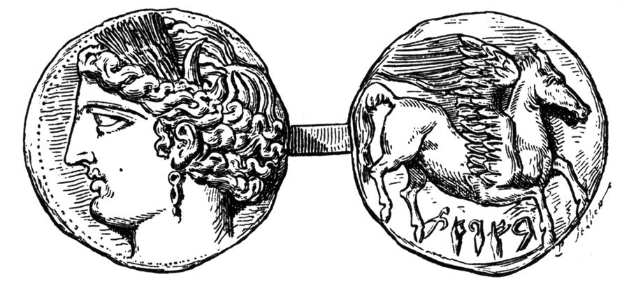 Отметим кстати, что на аверсе монеты, представленной на рис.3.4, изображена, по сообщению историков, нимфа АРЕТУЗА. На реверсе монеты - ПЕГАС, крылатый конь и <<пуническая надпись "БАРАТ" или, может быть, "Би Арат", "к Арату" - пуническое название Сиракуз>> [304:1], т.1, с.428. Но ведь оба слова: АРЕТУЗА и БИ-АРАТ или БАРАТ произошли, по-видимому, от слова ОРДА или АРТА, то есть РАТЬ, войско. Причем БИ-АРАТ или БАРАТ могло означать Б(елая) ОРДА, то есть Белая Русь. Может быть, имя АРЕТУ-ЗА произошло от сочетания ОРДА+ИСА, то есть ОРДА+ИИСУС или ОРДА+АЗИЯ. Все верно. Русь-Орда была христианским царством, была крещена ИИСУСОМ. Как мы уже говорили, само название АЗИЯ могло произойти от имени ИИСУС, поскольку самое большое христианское царство той поры - Русь-Орда - включала в себя огромные территории, именуемые сегодня "Азией". То есть АЗИЯ - страна ИСЫ = ИИСУСА.