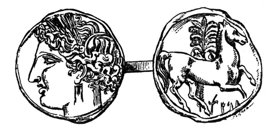# Оказывается, ТИПИЧНО КАРФАГЕНСКИМ сюжетом, отображавшимся, например, на карфагенских монетах, был конь на фоне дерева. Считается, что на фоне пальмы, рис.3.4 и рис.3.5. Действительно, на первой монете мы видим крылатого коня. На второй - конь, из-за которого видно дерево. Может быть, действительно пальма. Историки пишут так: "Лошадь, на заднем плане - пальма, ТИПИЧНО КАРФАГЕНСКИЙ СЮЖЕТ" [304:1], т.1, с.428.