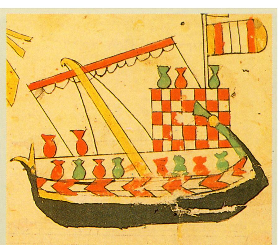 Далее, на рис.7.4 приведено изображение из старинной арабской рукописи "греческого огня" на судне. Показаны "кувшины с огнем", как думают историки [578], кн.1, с.132. Историки считают, будто вылеплены эти "кувшины" из глины. На самом же деле, скорее всего, это металлические пушки. На корабле установлена целая батарея таких орудий-кувшинов.