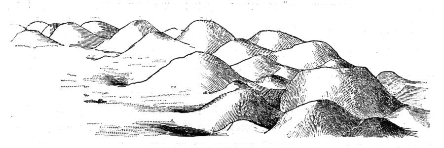 Как выглядели старые русские курганы? В выпуске "Известий Императорской Археологической Комиссии", изданном в 1905 году, которым мы сейчас пользуемся, почему-то не приведены фотографии многочисленных владимиро-суздальских курганов, уничтоженных "раскопками" Уварова. Имеется лишь беглая зарисовка нескольких курганов у села Городища, рис.9.1. Рисунок странно примитивен. Оценить масштаб сооружений невозможно, поскольку никаких деталей не показано.