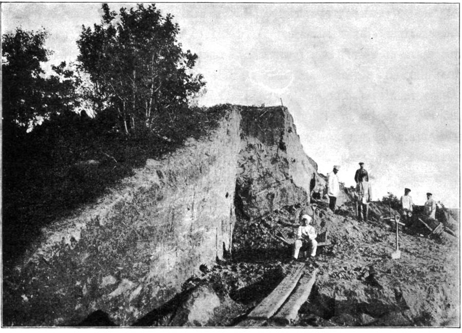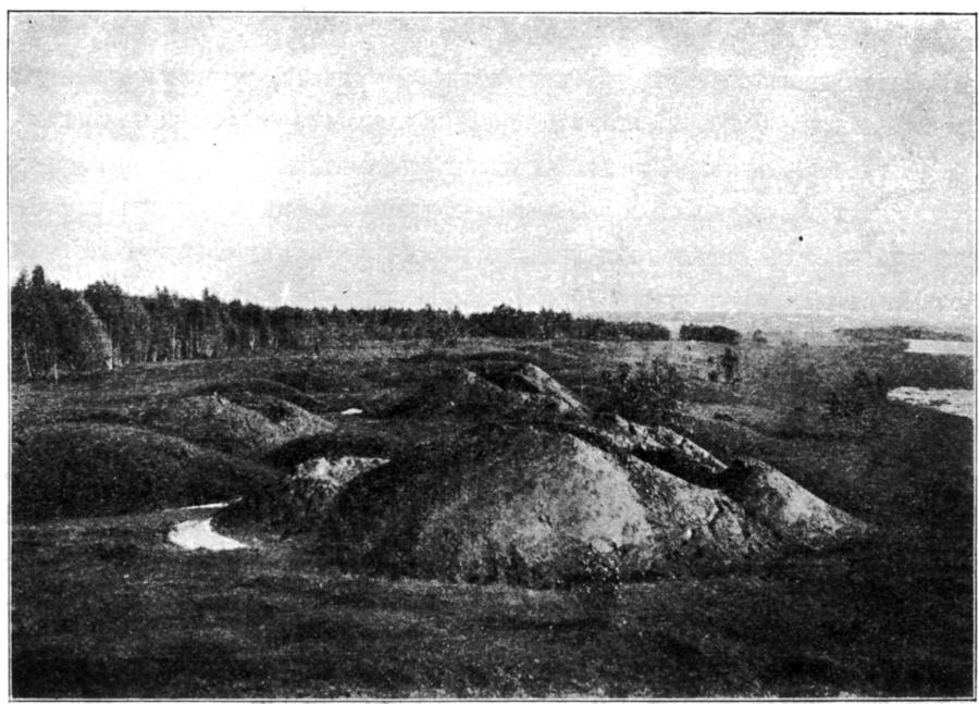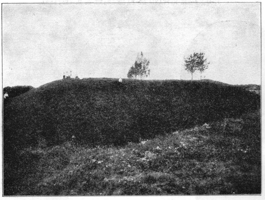 Далее, в издании [305:0] показана фотография нескольких гнездовских курганов из окрестностей Смоленска, рис.9.2. Видно, что эти курганы представляли из себя довольно внушительные сооружения: на заднем плане - лесной массив. На рис.9.3 приведена фотография еще одного из гнездовских курганов, примыкающего к валу большого Гнездовского городища. Его большие размеры можно оценить по высоте деревьев на вершине. Других изображений русских курганов в книге [305:0], к сожалению, нет. На фотографии, приведенной на рис.9.4, запечатлено начало работ на одном из гнездовских курганов. Раскопками руководил С.И.Сергеев. "Всего в течение трех лет им вскрыто 96 курганов" [305:0], с.6.