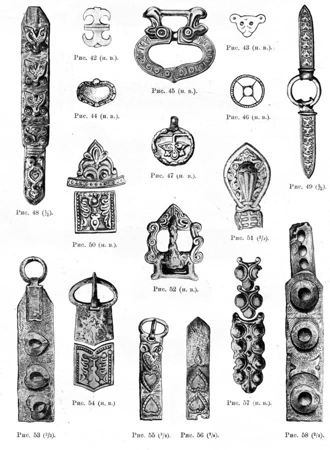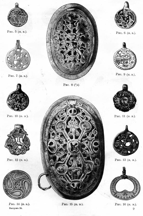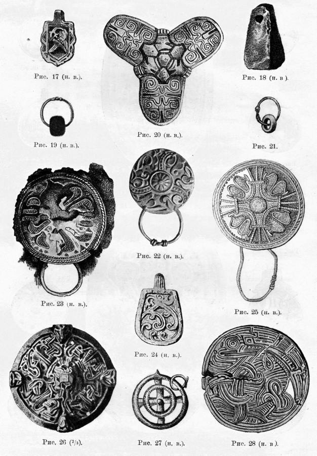 На рис.9.6, рис.9.7, рис.9.8 и рис.9.9 приведены некоторые вещи, найденные во время раскопок, и которые романовские историки сочли возможным показать публике. Вещи красивые, но "не опасные" для скалигеровско-романовской истории. Никаких надписей на них нет. По-видимому, большинство остальных находок с надписями и ордынской символикой были либо глубоко запрятаны в хранилищах, либо, попросту, уничтожены на месте, прямо в поле. Дабы не смущали они своим "неправильным" видом и еще более "неправильными" надписями романовских историков и читателей их трудов. После основательной очистки Суздальской и Владимирской областей от старых русских курганов, романовские историки, надо полагать, вздохнули с облегчением. Алиби стало прочнее.