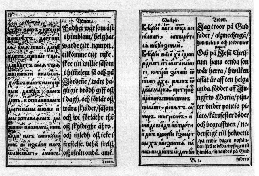 <<Густав Адольф в 1618 г. пригласил голландского литейщика и печатника Петера ван Зелова, который должен был создать (или восстановить после погрома Реформации? - Авт.) в Стокгольме КИРИЛЛИЧЕСКИЕ шрифты... В типографии ван Зелова вышел Alphabetum Rutenorum ("Российский алфавит", 1638 [?]) - азбука, в которой кириллический алфавит был представлен вместе со шведскими произносительными эквивалентами ( рис.9.11 - Авт.). Кроме того, в эту книгу вошли Отче наш, Символ веры и Десять заповедей Господних - параллельный текст на церковно-славянском языке в левом столбце и на шведском - в правом...