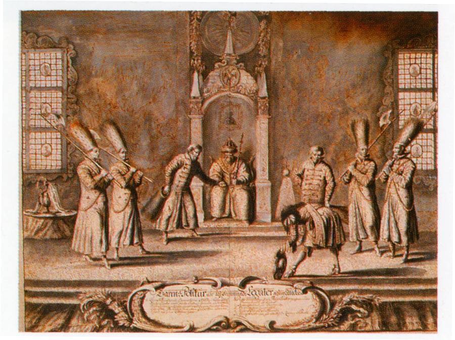 Этот штрих довольно интересен. С одной стороны, западные путешественники XVII века могли уже не очень понимать сути некоторых русских обычаев. С другой стороны, не исключено, что действительно подобные описания доносят до нас атмосферу романовского двора той эпохи. Конечно, Романовы на первых порах были откровенными ставленниками Западной Европы и послушно следовали политике западных реформаторов, оккупировавших Россию в эпоху Великой Смуты. Однако, оказавшись во главе бывшей метрополии Великой = "Монгольской" Империи, Романовы, надо полагать, через некоторое время захотели стать более самостоятельными и избавиться от назойливого западноевропейского контроля. В связи с этим, а особенно после того как Россия вновь окрепла и превратилась в разрастающуюся империю, Романовы могли подчеркнуто демонстрировать западным дипломатам и вообще путешественникам, что русские императоры восседают на бывшем троне Великой = "Монгольской" Империи, Царского Рима. Дескать, не забывайте, куда приехали. Знайте свое место. Тем более, что первые Романовы, как, впрочем, и многие западные европейцы того времени, не могли не помнить о том, что совсем недавно Западная Европа входила в состав Русско-Ордынской Империи = "античного" Рима и управлялась русско-ордынскими наместниками. Беспрекословно подчинявшимися единственному царю-хану, Императору Орды. Эти воспоминания, хотя и глухие, еще бытовали.