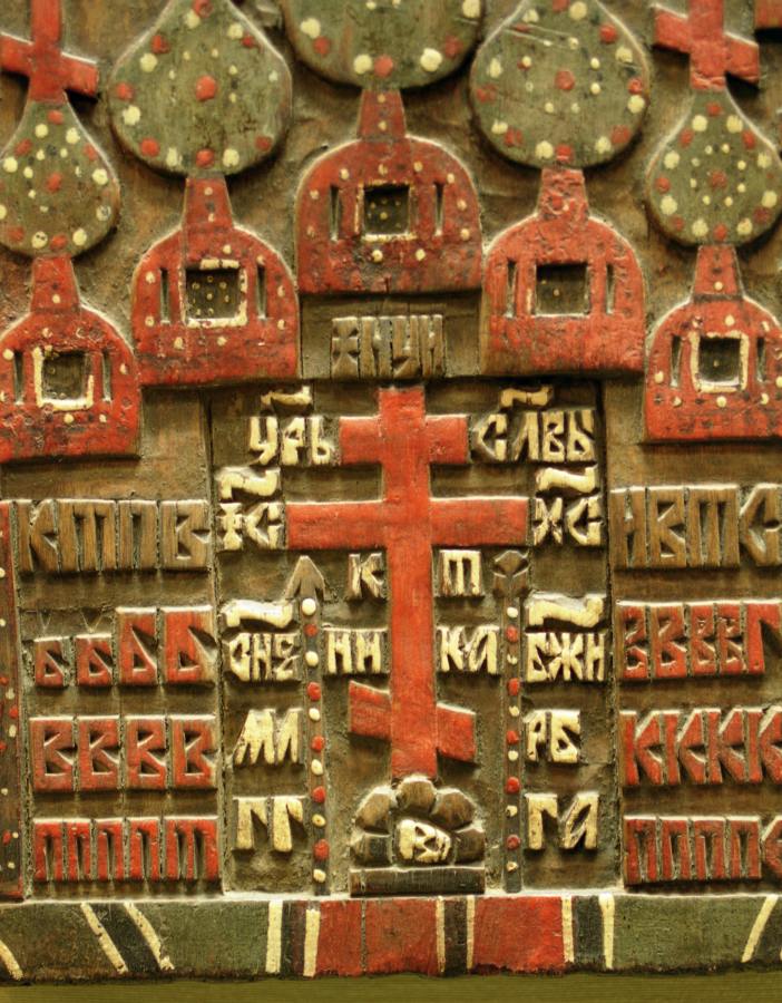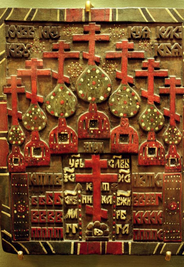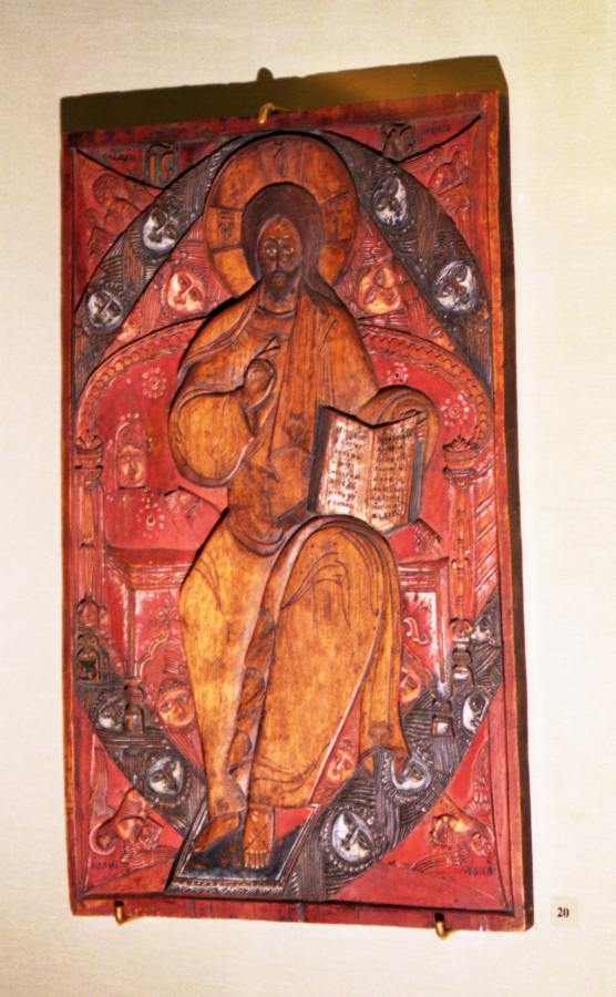 Здесь мы приведем еще один яркий пример титлы над буквой ОН, обнаруженный Т.Н.Фоменко в церкви Ризположения Московского Кремля, рис.9.16. Речь идет о русской деревянной иконе, показанной на рис.9.17. Совершенно отчетливо видна титла над ОН; эта буква писалась как О. См. рис.9.18 и рис.9.19.