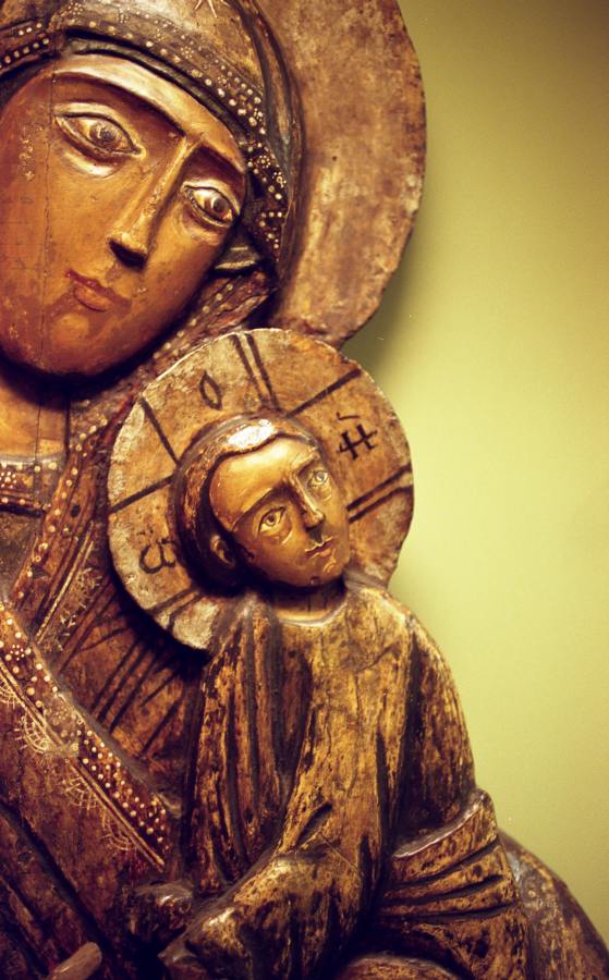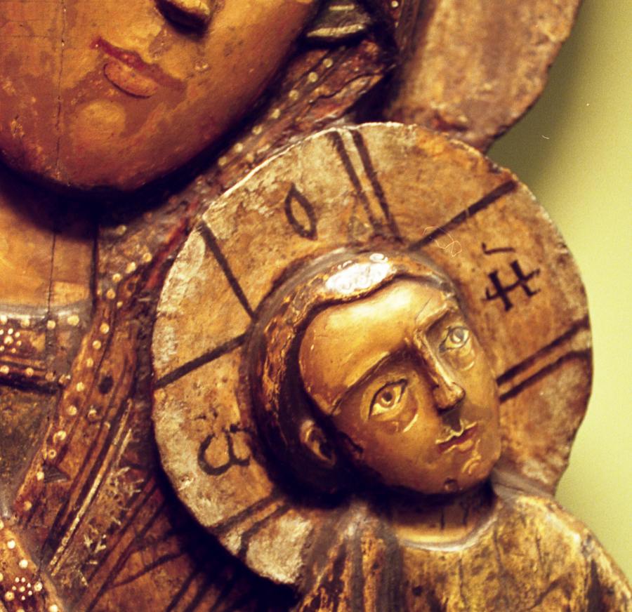В той же Церкви Ризположения находится икона Богоматери с Младенцем Христом, на нимбе которого титла поставлена над последней буквой ИЖЕ, рис.9.20, рис.9.21, рис.9.22. Вообще говоря, по старым правилам, в случае записи указанного выше числа 878 титла должна стоять над буквой ОН, то есть над ПРЕДПОСЛЕДНЕЙ буквой слова. Однако иногда это правило нарушалось и титлу ставили над последней буквой. Именно такую ситуацию мы и видим на данной иконе.