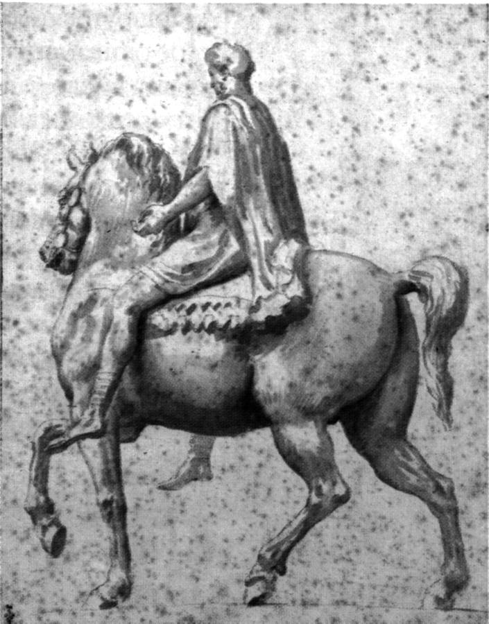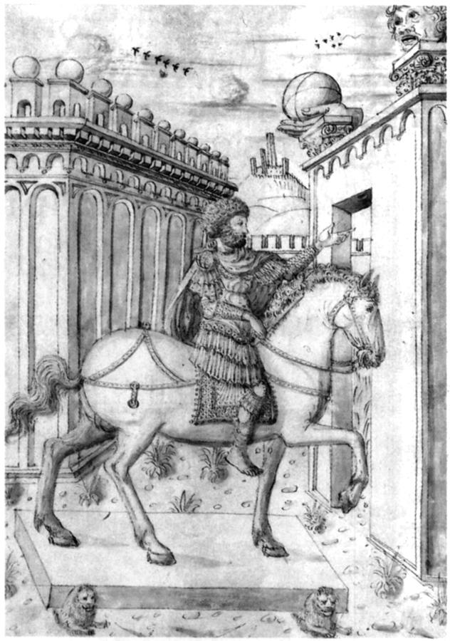 На рис.9.29 приведен старинный рисунок статуи, именуемой сегодня статуей римского императора "Марка Аврелия". Она и сегодня стоит в Риме. Однако раньше бытовали самые разные мнения о том - кто тут изображен. На самой статуе надписи нет. В частности, магистр Григорий, якобы в эпоху XII-XIII веков, писал: "Перед папским дворцом - Латераном - стоит бронзовая статуя: конь огромен, его всадник, в которые некоторые видят ТЕОДОРИХА, сидит прямо... В римском народе он считается императором КОНСТАНТИНОМ, а кардинал и клирики Римской курии называют императором МАРКОМ, или КВИНТОМ КВИРИНОМ" [535:00], с.21,24.