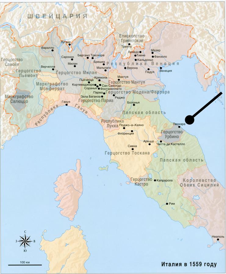 Франческо Мария, по смерти Льва... вновь овладел (1525 г.) герцогством Урбино, которое и оставалось в его роде В ТЕЧЕНИЕ СТА ЛЕТ. Сам он был главнокомандующим войсками Венеции и священной лиги... Умер Франческо Мария от отравы... (1538 г.). Его сын Гвидобальдо получил герцогство Урбино в лен... Умер в 1574 г.