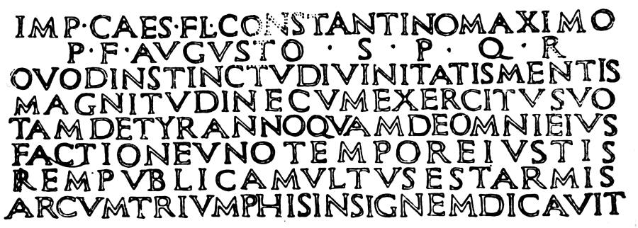 Imp(eratori) Caes(ari) Fl(avio) Constantino Magno, P(atri) P(atriae), Augusto, s(enatus) p(opulus)q(ue) R(omanus), quod instinctu divinitas, mentis magnitudine cum exercitu suo tam de tiranno, quam de omni factione eius uno tempore iustis rem publicam armis ultus est, arcu(m) triuphalem dicavit.