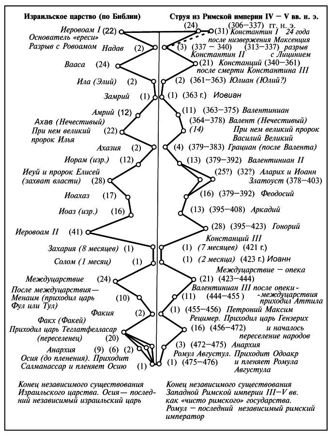 Далее, внутри "учебника Скалигера-Петавиуса" были найдены загадочные царские династии-дубликаты. То есть фантомные отражения одной и той же реальной династии, но помещенные поздними хронологами и редакторами XVII-XVIII веков в якобы совершенно различные исторические эпохи и даже страны. Один такой пример показан на рис.0.3. См. "Основания истории", гл.6. Здесь якобы "древнейшая" династия израильских царей оказывается отражением более поздней "античной" династии римских императоров. Причем обе эти династии являются фантомными отражениями одной и той же реальной династии XIII-XVII веков н.э.
