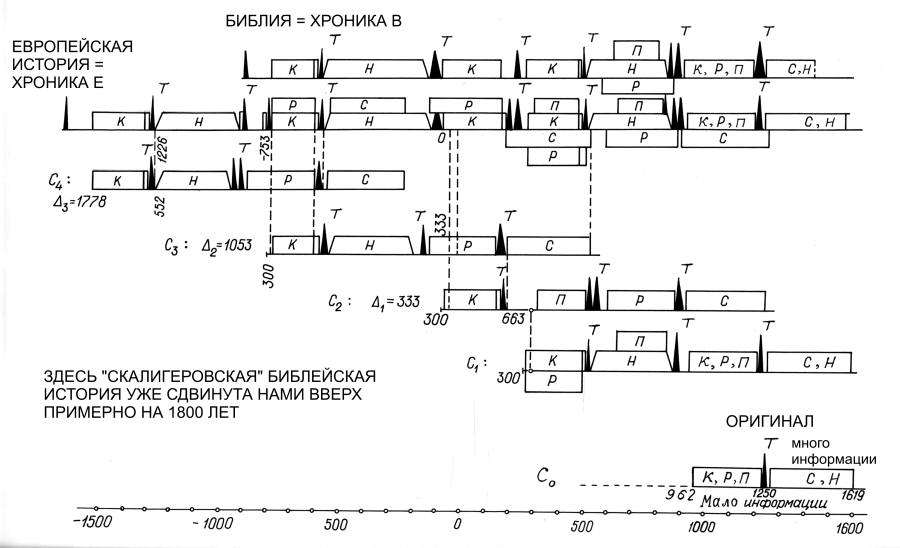 Подведем итог этого этапа исследований. На основе перечисленных методов и статистических результатов А.Т.Фоменко выявил глобальную картину хронологических передатировок в версии Скалигера, после которых ошибки этой версии в основном устраняются. В частности, А.Т.Фоменко обнаружил три важных сдвига в хронологии примерно на 333 года, 1053 года и 1800 лет. Эти сдвиги, конечно, присутствуют не в реальной, правильной хронологии, а лишь в ошибочной версии Скалигера-Петавиуса. Оказалось, что "скалигеровский учебник" склеен из четырех копий одной и той же короткой хроники. Этот основополагающий результат условно показан на рис.0.4.
