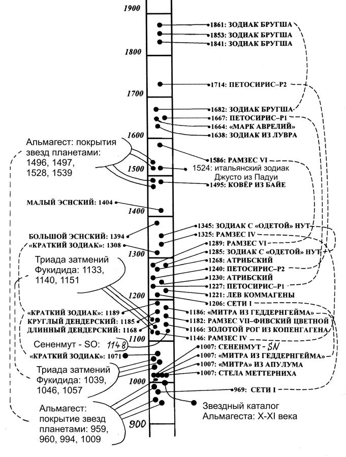 Изучая литературу, нам удалось обнаружить достаточно большое число старинных зодиаков. Многие из них удалось датировать. Перечислим старинные зодиаки, как египетские, так и европейские, датированные нами ранее, см. "Звезды", [НХЕ], [НХИ], [НОР], [КР], а также см. рис.0.5. в настоящей книге, Нам удалось точно датировать многие древние зодиаки благодаря сделанному нами важному наблюдению, ранее никем не отмеченному. Оказалось, что древние астрономы, записывая дату на памятнике с помощью гороскопа, стремились сделать запись как можно более точной. Поэтому, кроме основного гороскопа они добавляли дополнительные "частные гороскопы" и другую астрономическую информацию. Они указывали, например, положения околосолнечных планет во время летнего и зимнего солнцестояний, весеннего и осеннего равноденствий. Суммарная информация, сосредоточенная на одном зодиаке оказывалась при этом настолько богатой, что однозначно определяла не только его астрономическое решение - датировку - на всем историческом интервале длиной в пять тысяч лет, но и позволяла ВЫЧИСЛИТЬ и ДОКАЗАТЬ расшифровку астрономической символики этого зодиака путем компьютерного перебора всех возможных вариантов дешифровки. Подробное изложение разработанного нами метода расшифровки и датирования старинных зодиаков, см. в [НХЕ], "Звезды Зодиака". Приведем здесь лишь окончательный результат. В нижеследующем списке даты после 1582 года приведены по юлианскому календарю по "старому стилю".