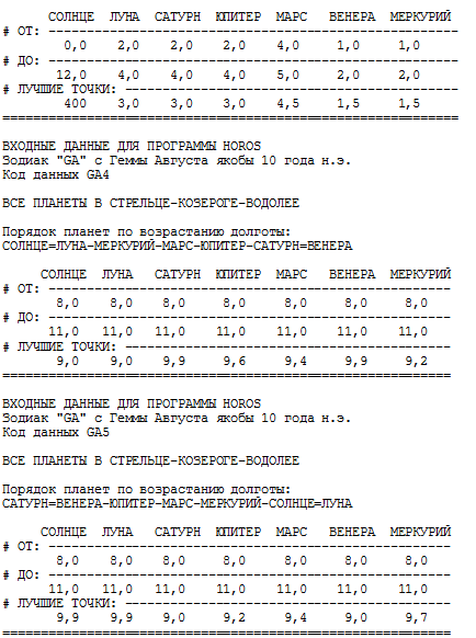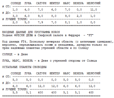 Поясним, что большинство старинных зодиаков содержит достаточное количество дополнительных астрономических сведений, обеспечивающих не только единственность полного решения, но и высокую степень устойчивости этого решения по отношению к колебаниям расчетных параметров. Независимость полных решений от колебаний границ созвездий обеспечивается, в частности, тем, что при поиске множества предварительных решений с помощью программы HOROS интервалы допустимых положений планет всегда берутся с автоматическим расширением на 5 градусов дуги в обе стороны. Кроме того, мы, как правило, еще и вручную, дополнительно расширяли эти интервалы чтобы свести вероятность потери полного решения к нулю. При этом, естественно, возрастало количество предварительных решений и, соответственно, увеличивался объем работы по их анализу и отсеву. Оказалось, что количество предварительных решений, которые необходимо исследовать при поиске полного решения, довольно чувствительно к точным границам созвездий. После введении новых, уточненных границ объем работы сократился, а результат осталися прежним.