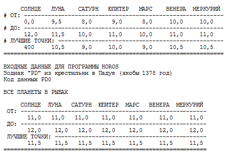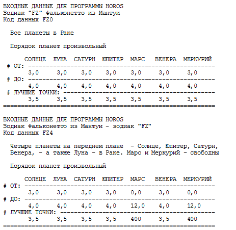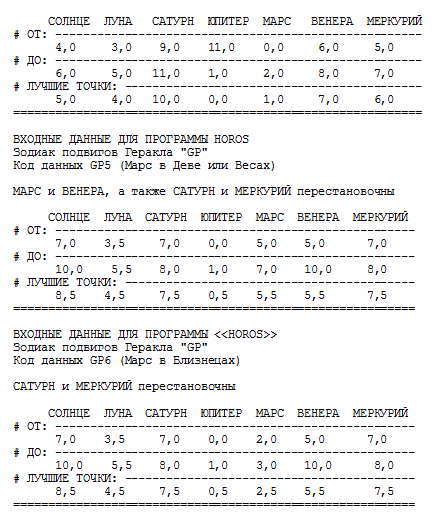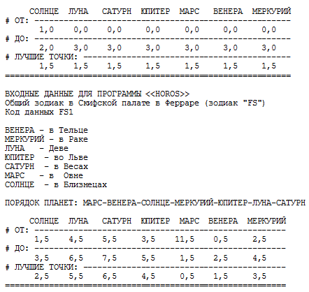 При составлении собственных входных данных, описывающих те или иные зодиаки, читателю следует иметь в виду, что изменения следует вносить в строки данных, но не в служебные строки. При этом для указания границ расположения планет необходимо пользоваться следующей циклической "шкалой созвездий", подробно описанной в разделе 5.10 книги "Новая хронология Египта":