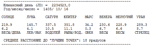 Приведем данные для программы HOROS, описывающие гороскоп. Положения планет и лучшие точки (точки примерного расположения планет, определяющие их взаимный порядок) даны по шкале созвездий, см. подробности в [НХЕ], гл.5.