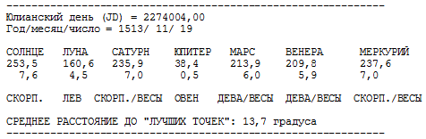 Приведем положения планет на 19 ноября 1513 года нашей эры, когда среднее отклонение от лучших точек, заданных нами выше, было наименьшим. Вообще же, условия гороскопа подвигов Геракла выполнялись в течение всех пяти дней 17-21 ноября 1513 года, Как обычно, мы даем положения планет в градусах на эклиптике J2000, а также по условной шкале созвездий, см. главу 5 в нашей книге "Новая хронология Египта". Приводится также название зодиакального созвездия, где находилась та или иная планета.