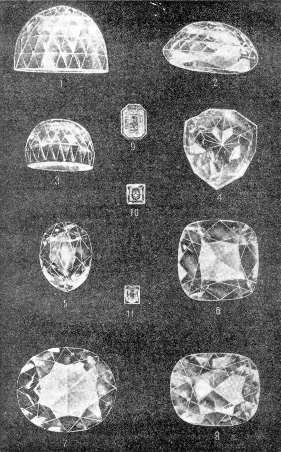 1) “The Diamond Tablet – an amazing individual stone [found in India – Auth.] . . . It is truly one of the so-called portrait stones . . . The stone is amazingly beautiful and pure and masterfully wrought in the old Indian cutting fashion, with two indentations covered in soft gold. This stone is but a shard . . . of some unknown gigantic diamond crystal found among the sands of Golkonda in India . . . Unfortunately, the fate of this diamond is unknown” ([876:1], page 218). It is presumed to have weighed around 242 karats (let us remind the reader that one karat equals 0.2 grammes). A small shard of the diamond, namely, the abovementioned diamond tablet (which weighs about 25 karats) is kept in the Diamond Vault of the Muscovite Kremlin. Incidentally, this fragment is nevertheless the largest “portrait stone” in the world ([876:1], page 219).