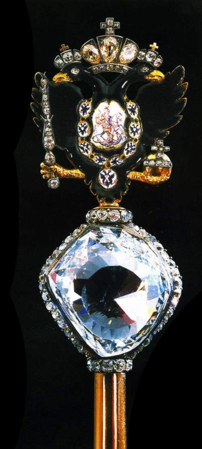 After the murder of Nader Shah, the stone was stolen and sold to Shaffrass, an Armenian millionaire. At any rate, the diamond was bought by Count Grigoriy Grigoryevich Orlov in 1774, who gave it to Empress Catherine the Great in a futile attempt to regain her favour. The Empress put the stone on the Sceptre of the Romanovs; nowadays it is kept in the Muscovite Diamond Vault” ([1118:1]). It is presumed that the stone’s “original weight must have equalled some 300 karats; the diamond in question was one of the two natural fragments of the large stone of the Great Moguls” ([876:1], page 219). It is also reported to be “the largest known diamond from India” ([876:1], page 220). On the other hand, A. E. Fersman claims that Count Orlov bought the “Orlov” diamond in 1772 ([876:1], page 220), and not in 1774, as the Encyclopaedia Britannica claims. There is obviously some confusion here.